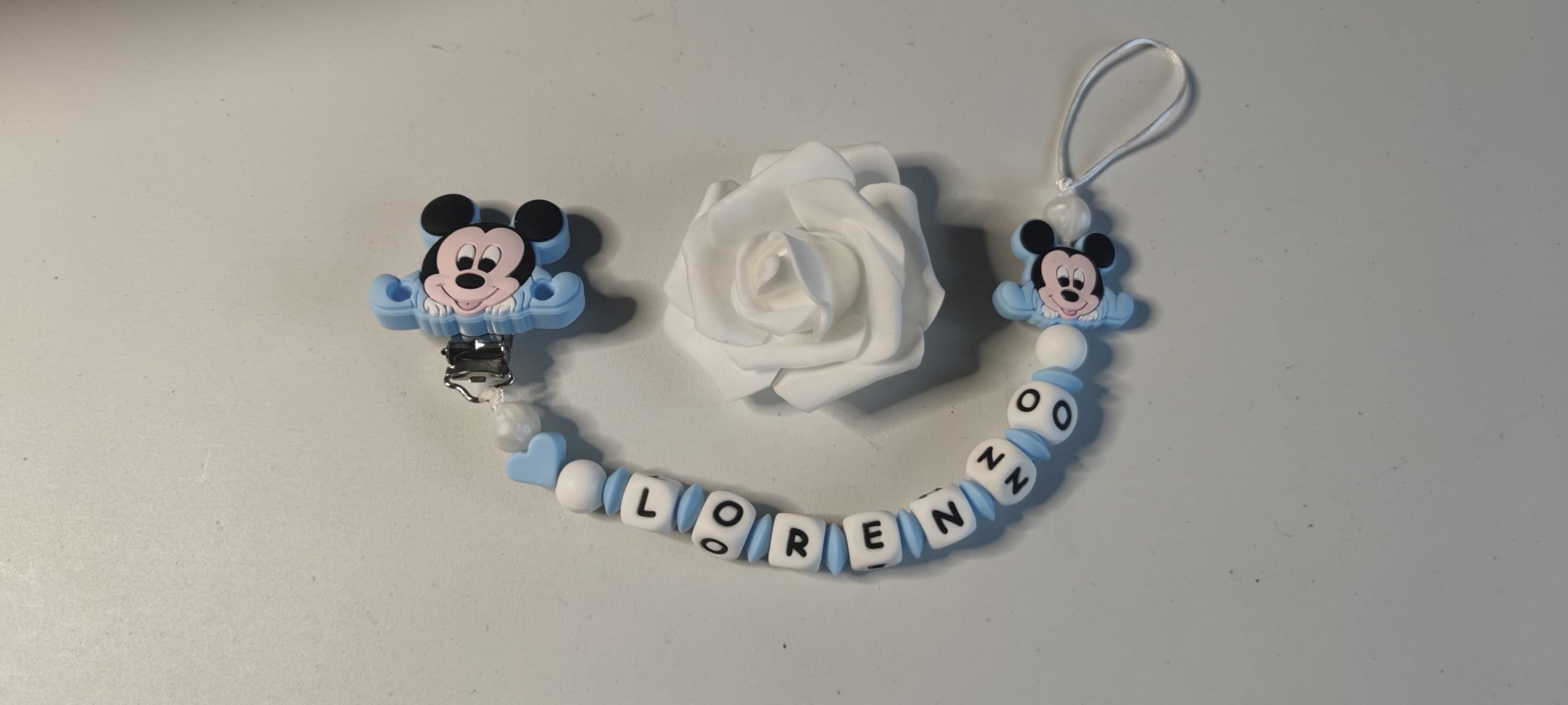 Porta un tocco di magia e dolcezza Disney nella vita del tuo bambino con questa adorabile catenella portaciuccio personalizzata, decorata con il simpatico e intramontabile topolino!