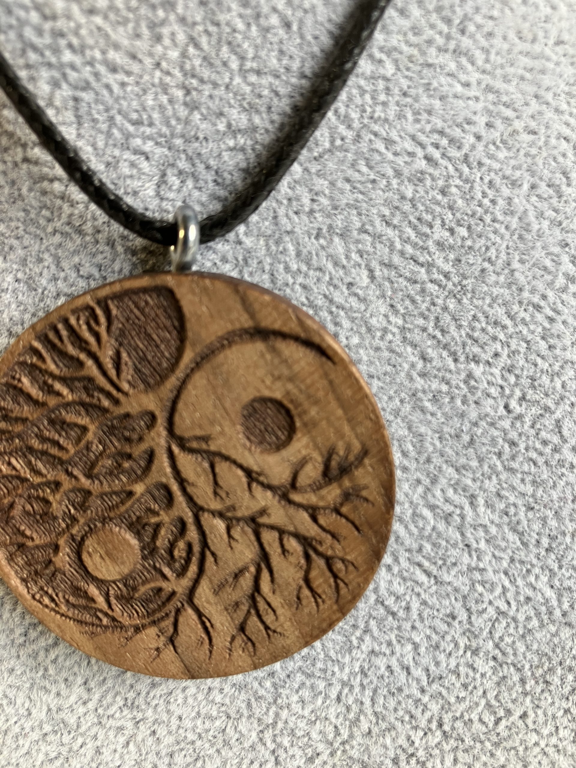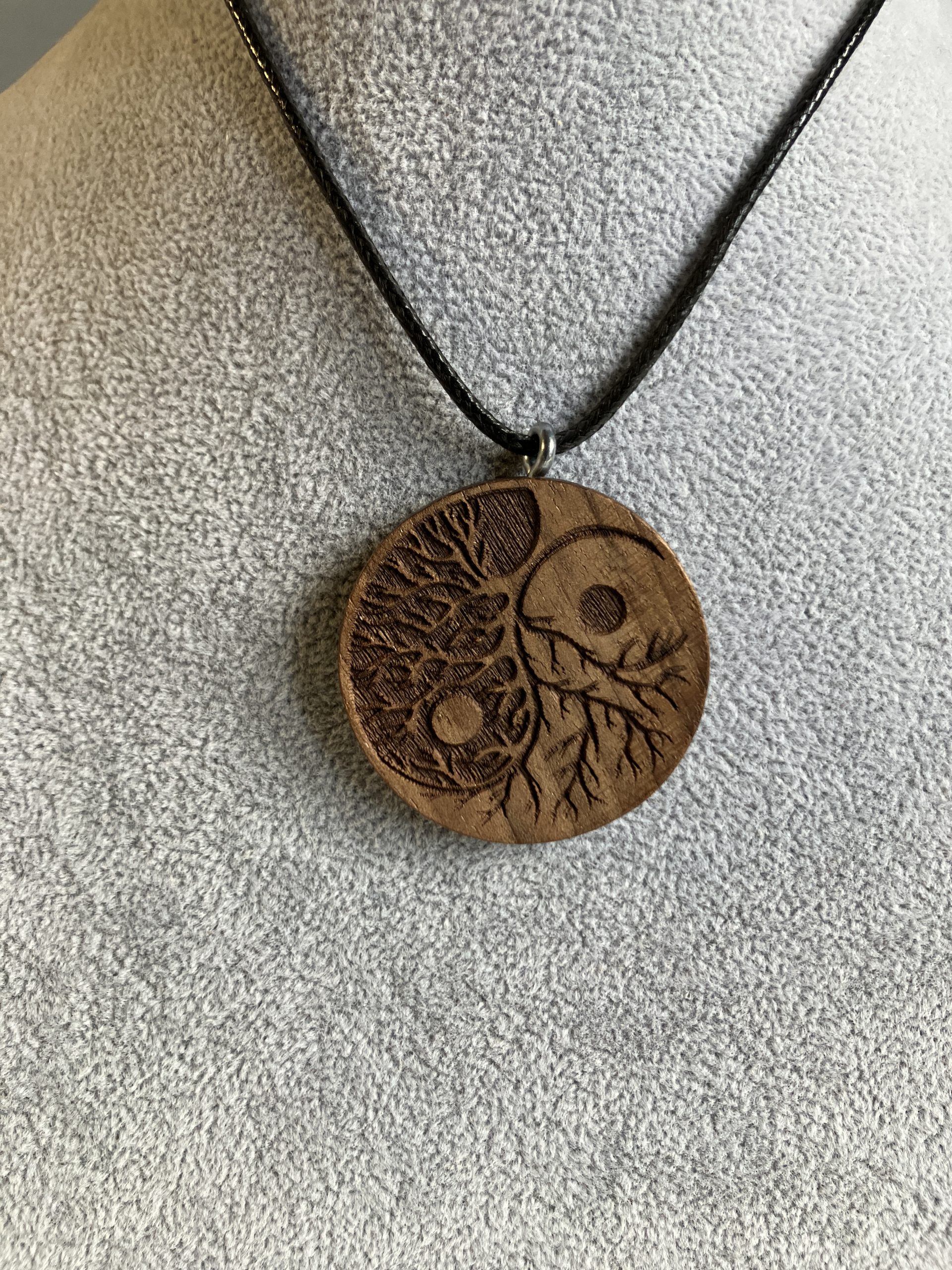 Collana artigianale in legno di noce con incisione laser e finitura a mano. Design Yin e Yang con alberi, diametro 40 mm. Elegante e perfetta per uno stile naturale.