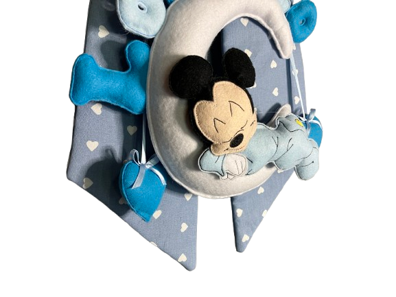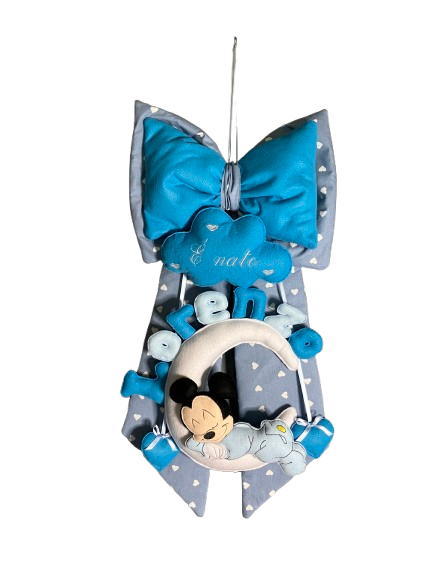 Realizzato a mano con amore e cura, questo Fiocco Mickey che Dorme è un piccolo capolavoro artigianale. La base è confezionata in soffice e resistente cotone, arricchita da dettagli in morbidissimo pannolenci, che rendono l’intero fiocco piacevolmente soffice al tatto. Il cuore della composizione è il dolcissimo Mickey Mouse, ritratto mentre dorme beatamente su una luna , simbolo di sogni tranquilli e desideri che si avverano. L’immagine di Mickey che riposa sereno catturerà subito l’attenzione di chiunque lo guardi, portando un sorriso di felicità.