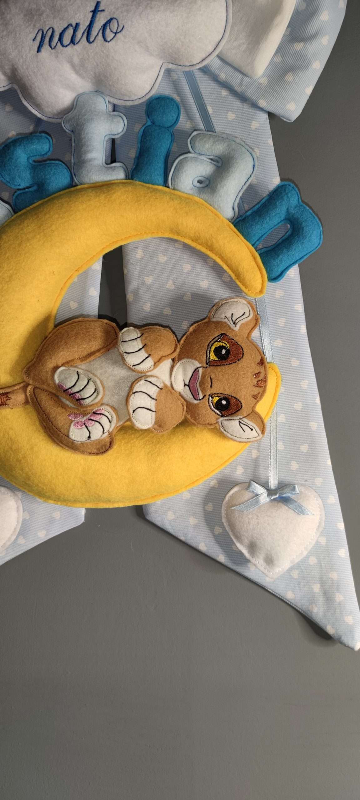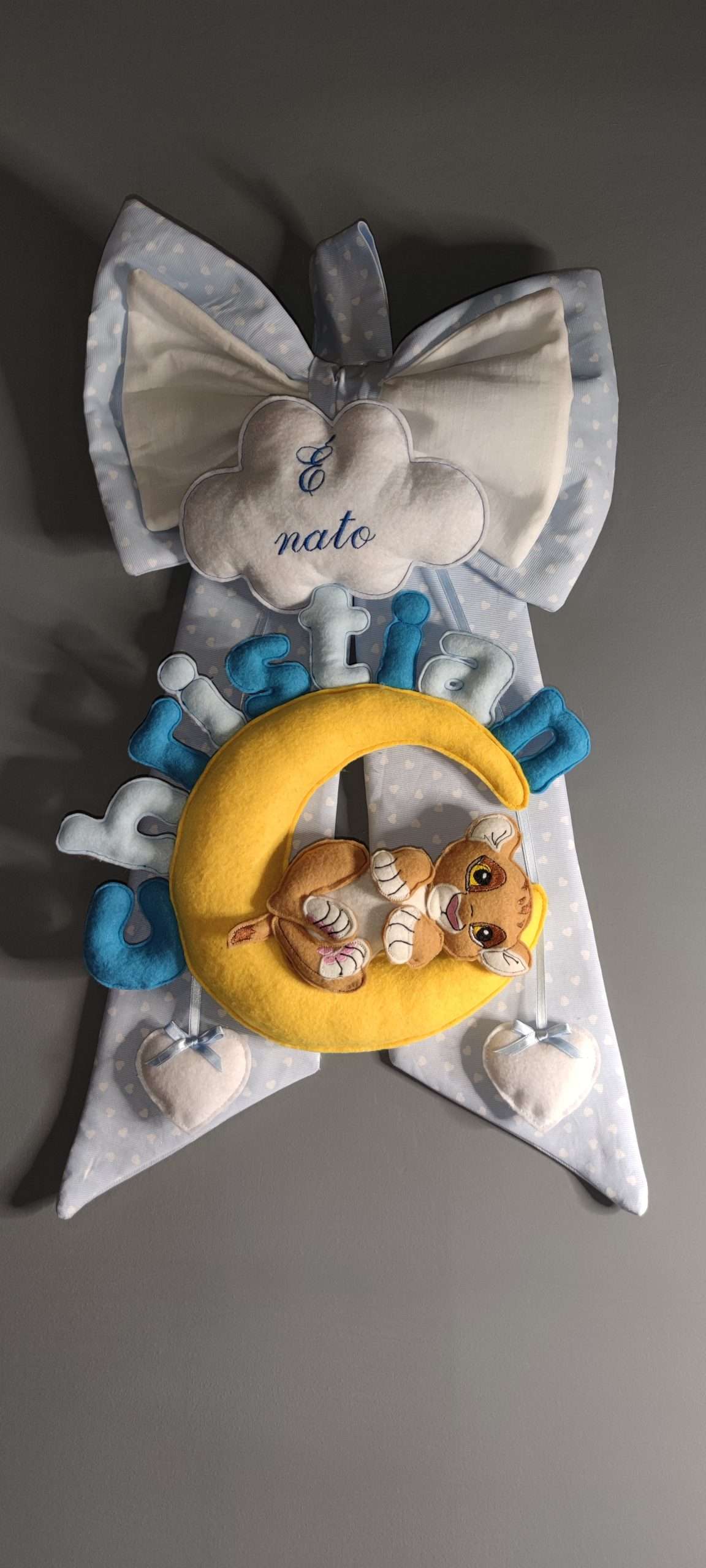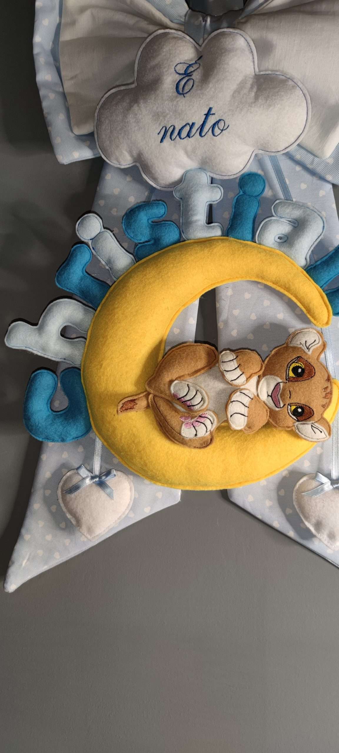Questo fiocco nascita artigianale non solo celebra la gioia di una nuova vita, ma anche l’amore per uno dei classici più amati della Disney, Il Re Leone. È un regalo perfetto per i nuovi genitori, che potranno appendere questa bellissima creazione alla porta di casa o nella cameretta del neonato, come simbolo di benvenuto e di inizio di una nuova, meravigliosa avventura.