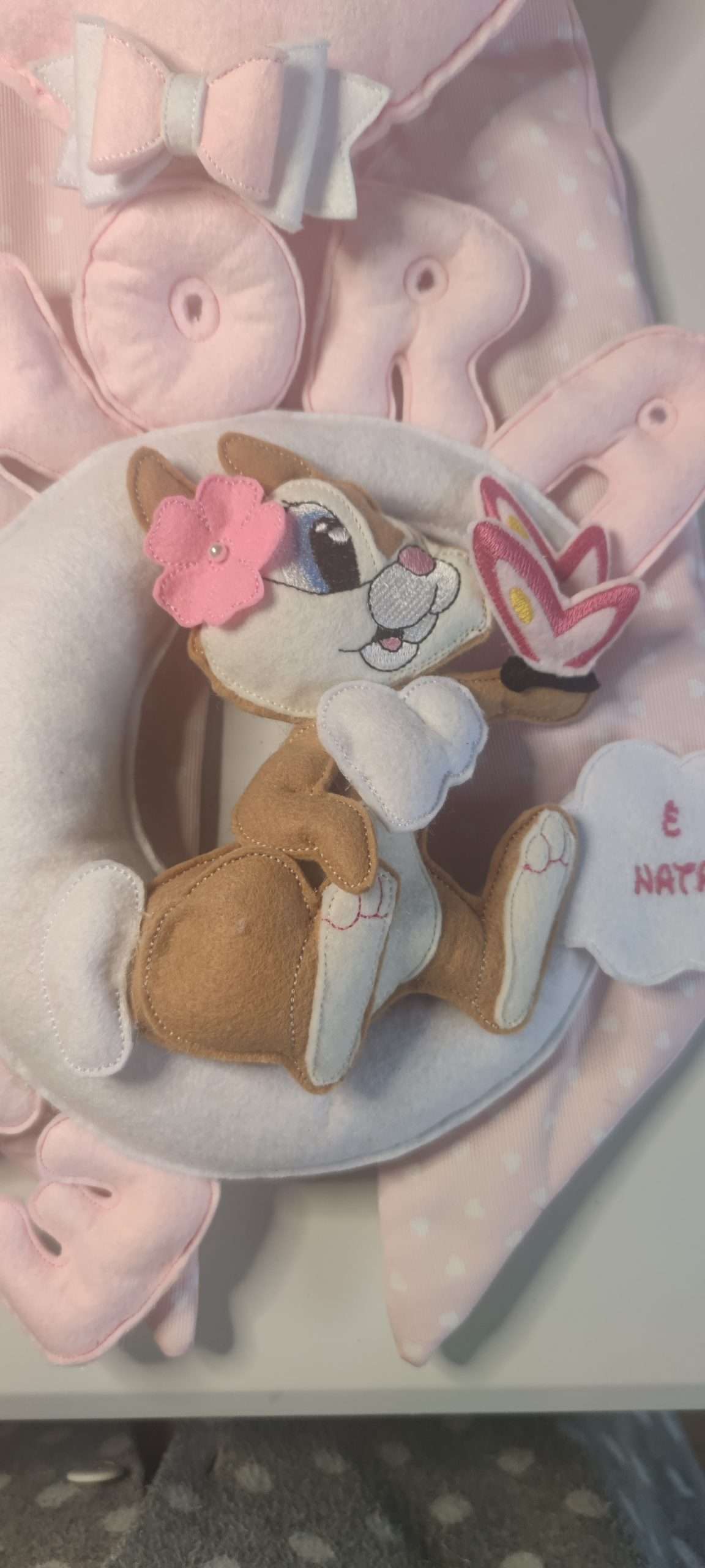 Design Delizioso: Al centro del fiocco spicca un adorabile pupazzetto di Tippete, la coniglietta amata di Bambi, reso con dettagli accurati che catturano la sua espressione dolce e giocosa.