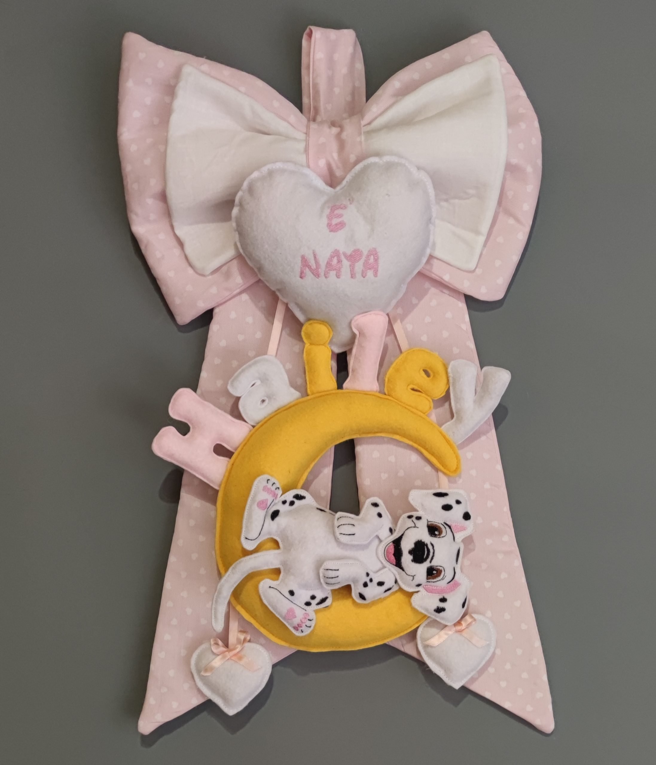 • Design Elegante: Fiocco con doppio strato, impreziosito da cuoricini imbottiti, nuvolette e dettagli ricamati a mano, per un risultato raffinato e curato.