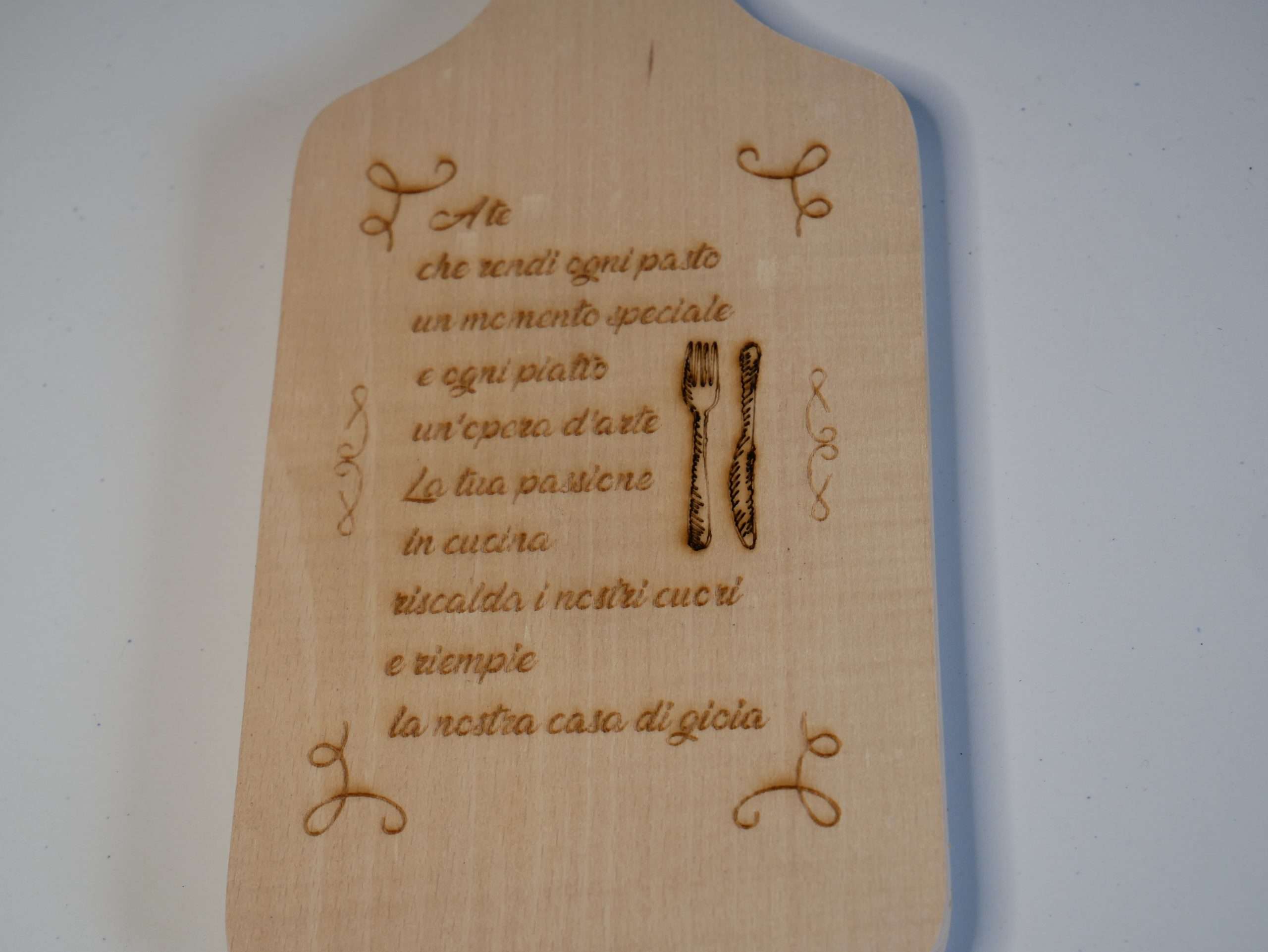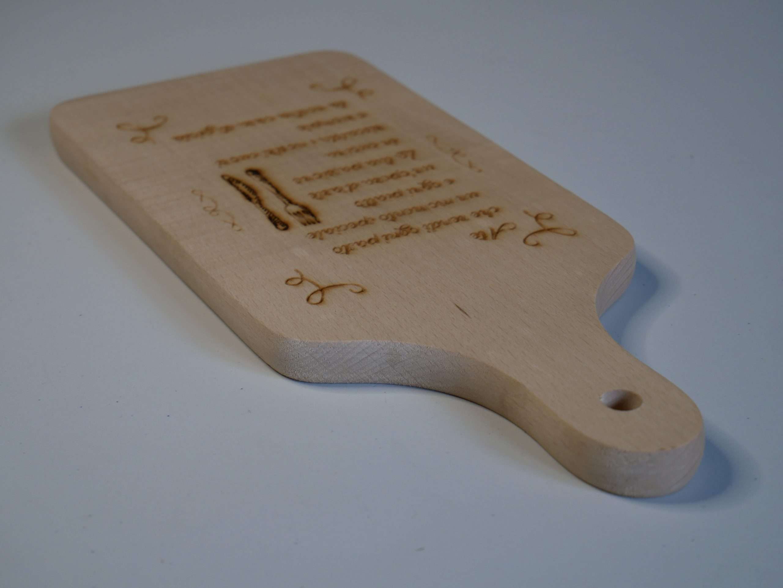 Tagliere in legno di faggio personalizzato con frase incisa, un accessorio unico e raffinato per la tua cucina.