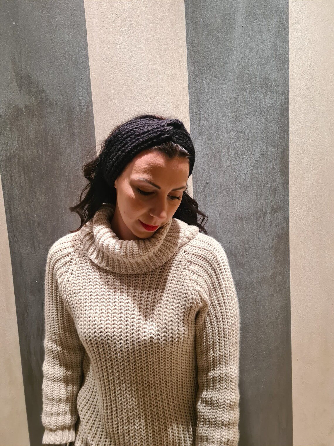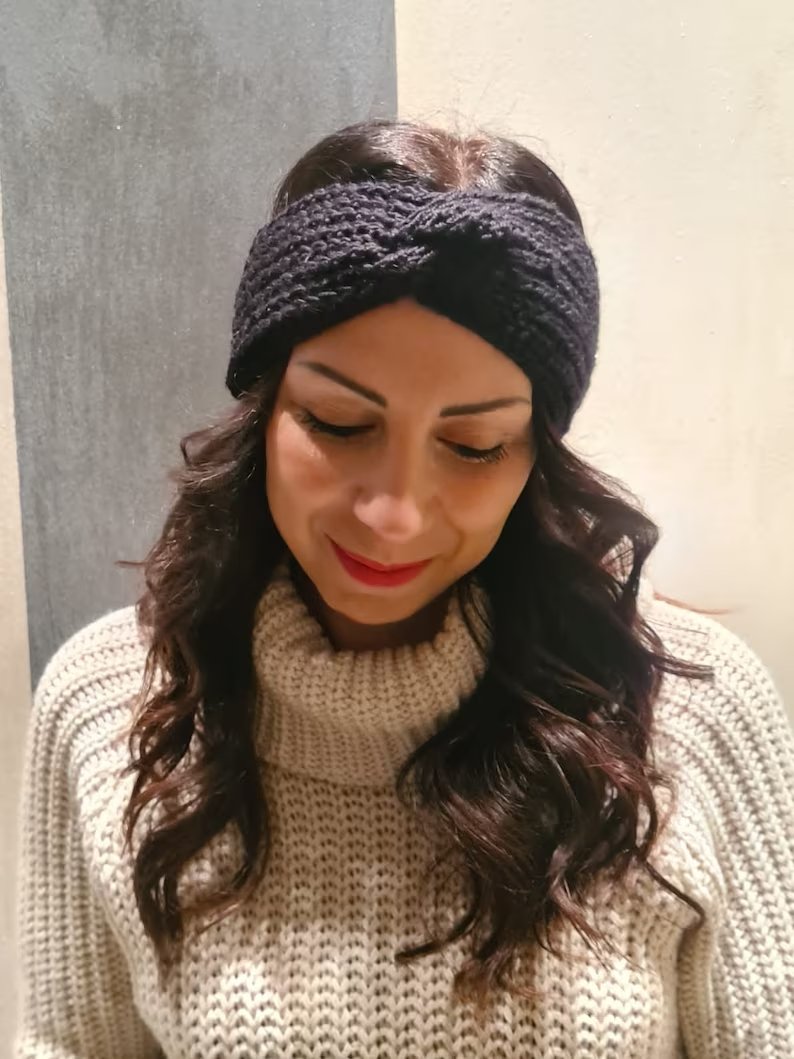 Fascia per capelli in lana, lavorata a mano all’uncinetto. Calda, morbida ed elegante con dettaglio a nodo centrale. Ideale per l’inverno e outfit casual.