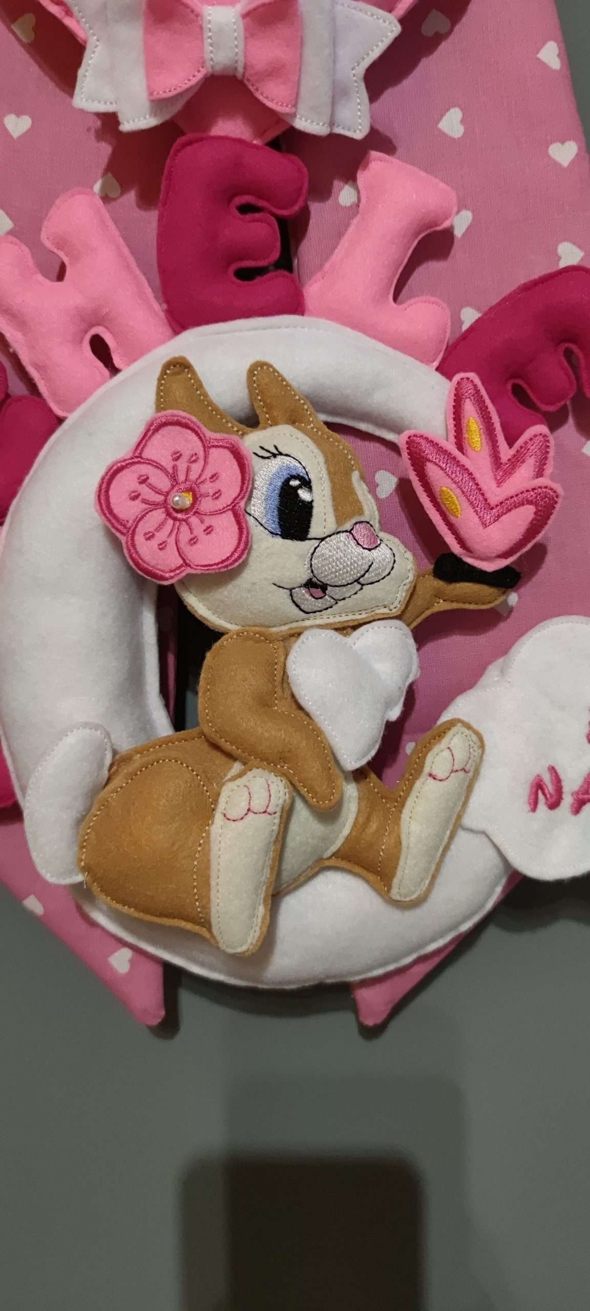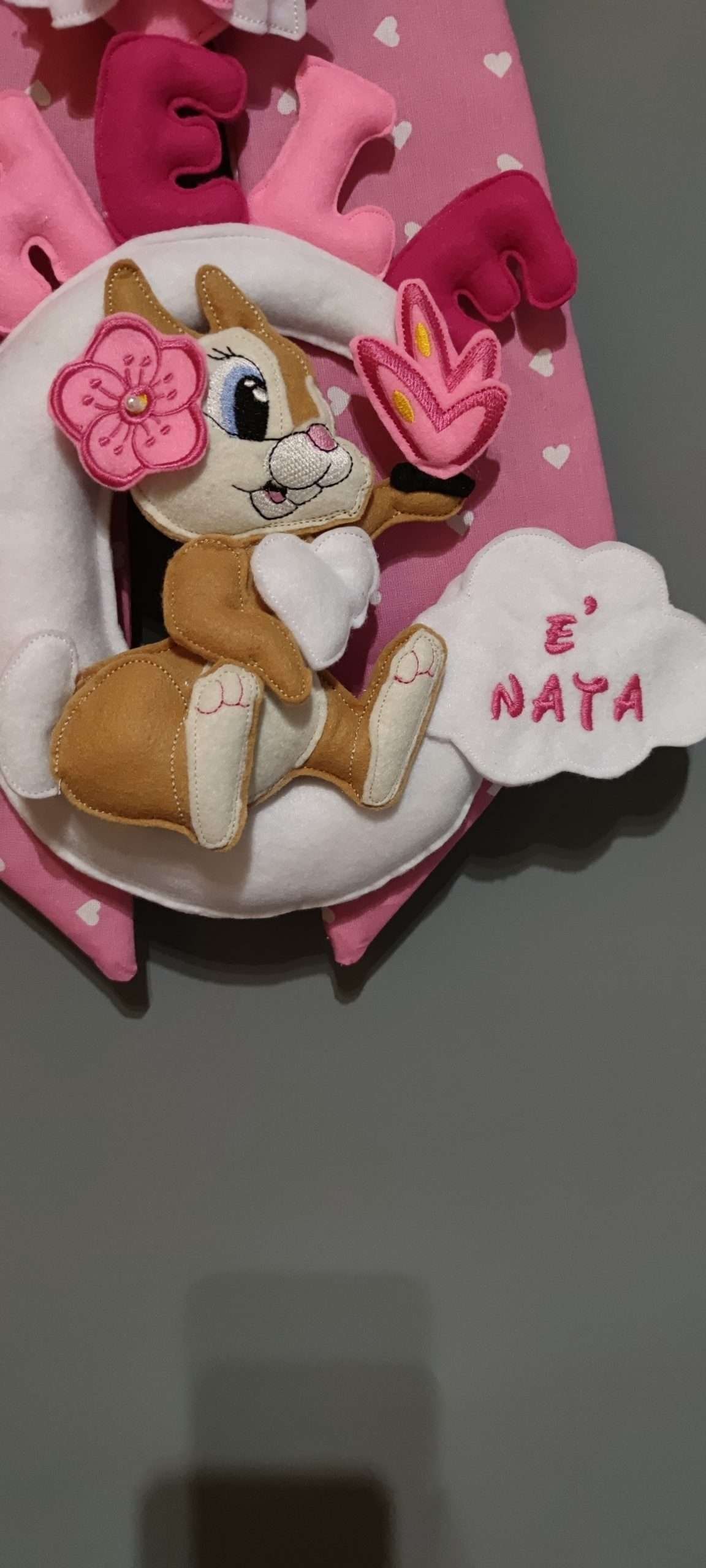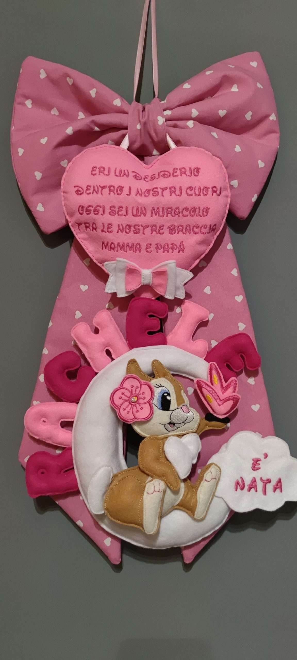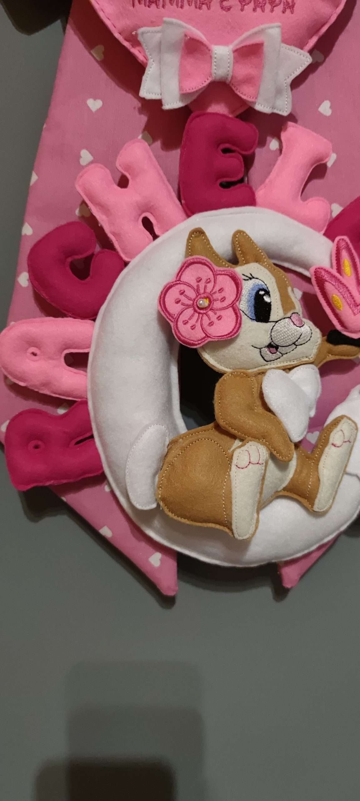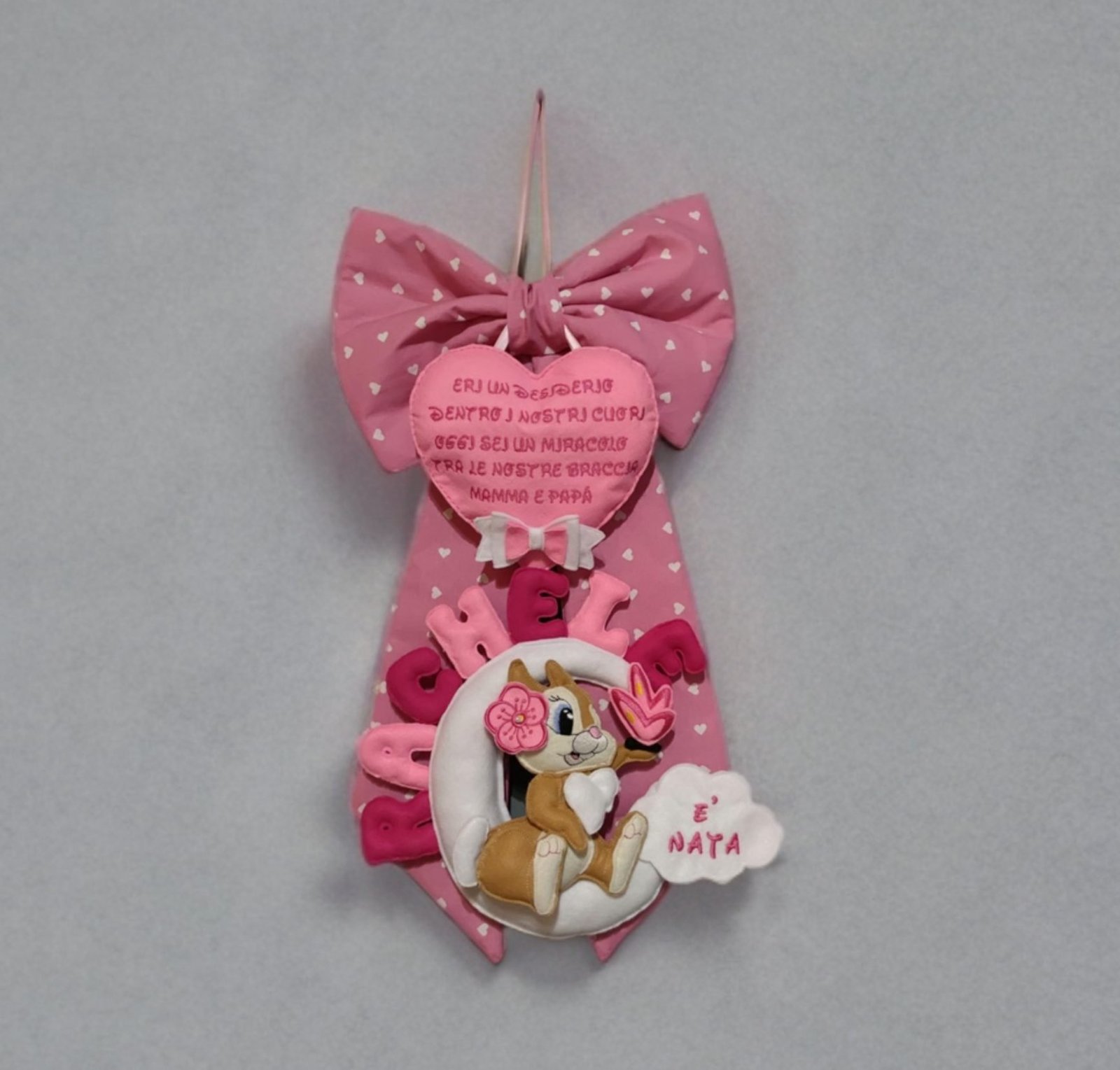 Incantevole fiocco nascita dedicato alla dolce coniglietta Tippete della Disney, un accessorio perfetto per celebrare l’arrivo del vostro piccolo tesoro. Realizzato artigianalmente con materiali di alta qualità, questo fiocco combina eleganza e tenerezza, ideale per aggiungere un tocco di magia alla vostra casa o alla cameretta del neonato.