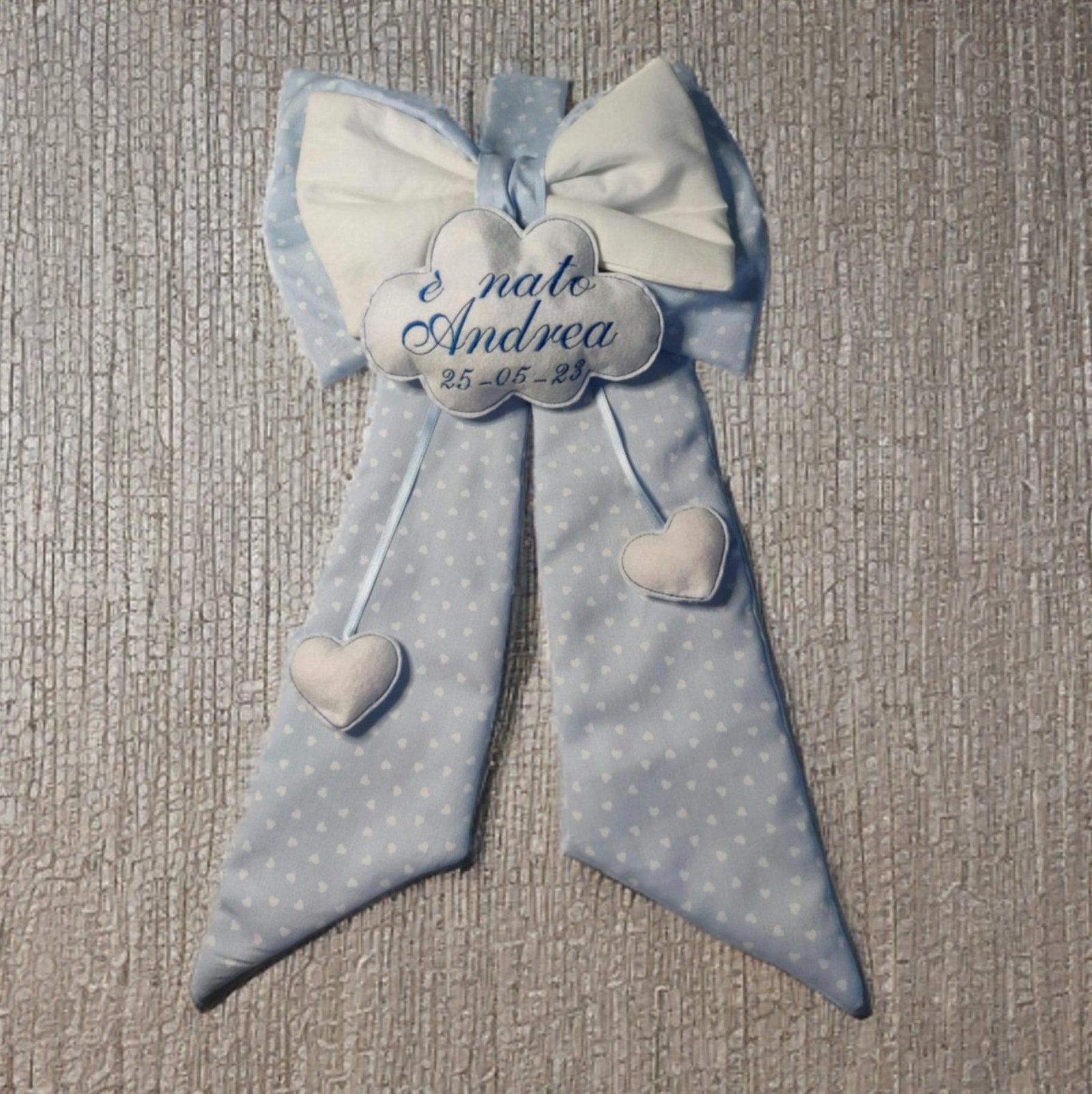 • Design Raffinato: Un grande fiocco azzurro con dettagli bianchi, arricchito da un cuore centrale con la scritta “È nato” e una dolce luna personalizzata con il nome del bambino. Piccoli cuori pendenti completano il design per un tocco di tenerezza.